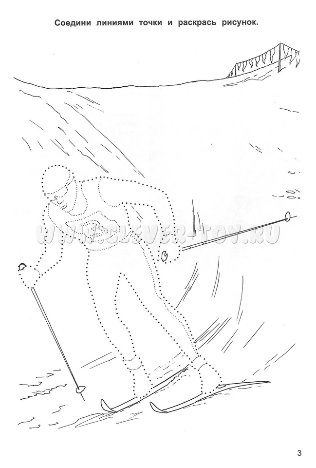 1. Соедини линиями точки и раскрась рисунок (иллюстрация лыжный спорт);