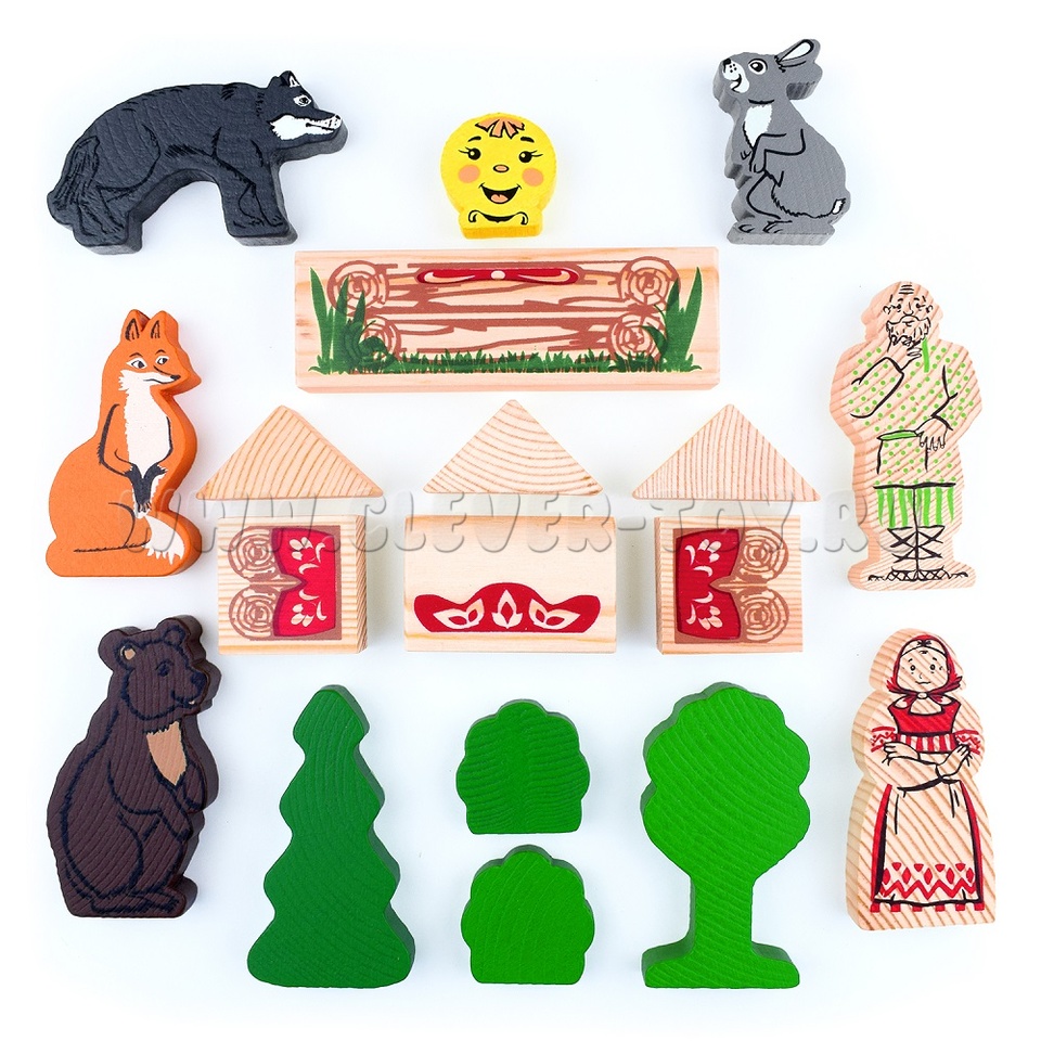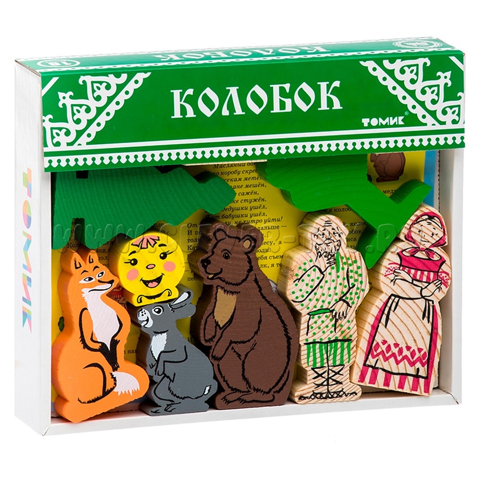 В набор входят деревянные модели персонажей и декорации сказки "Колобок" (всего 20 деталей), а также вкладыш с текстом сказки.
