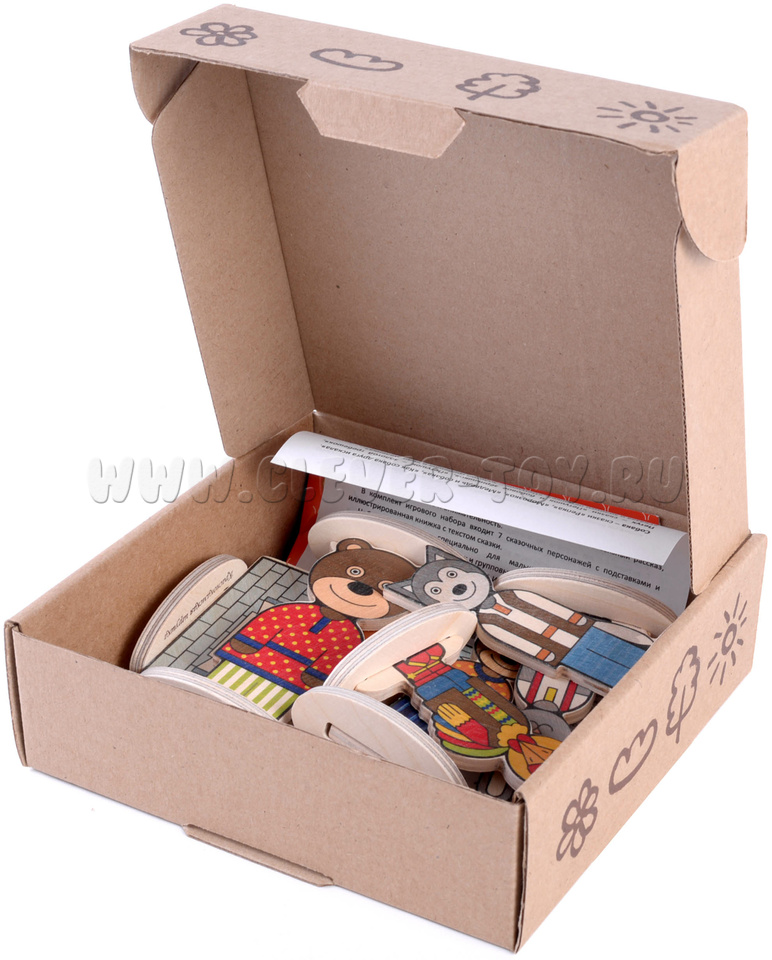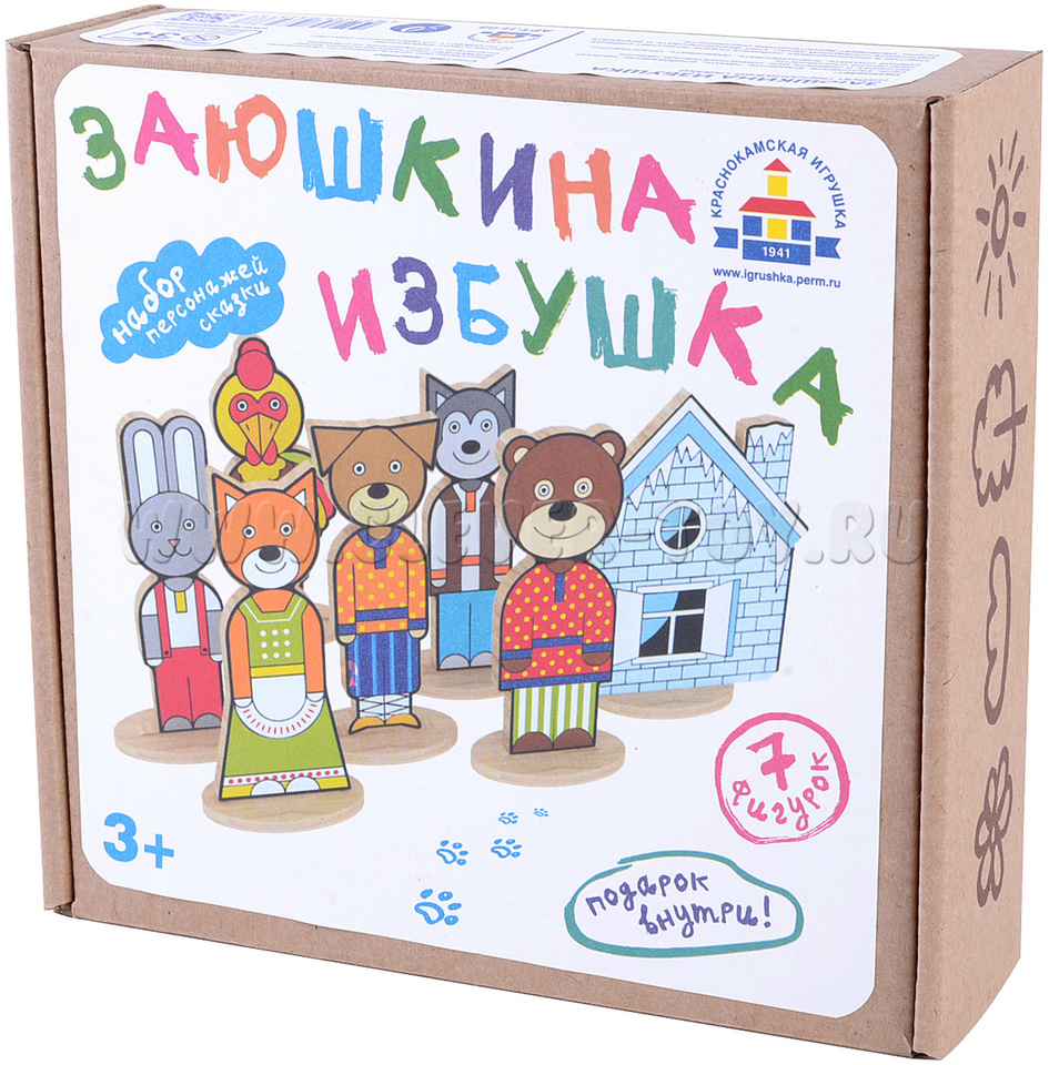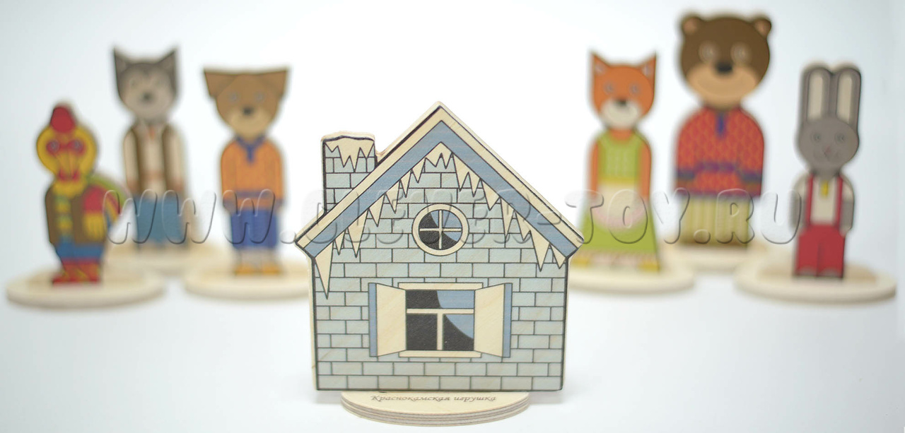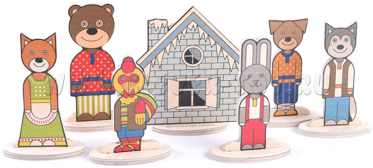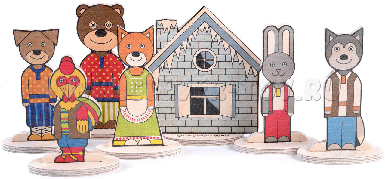 • 7 деревянных фигурок: (зайчик, лисичка, медведь, волк, петух, собака, двусторонняя избушка (лубяная и ледяная) - размер фигурок от 9 до 12 см;