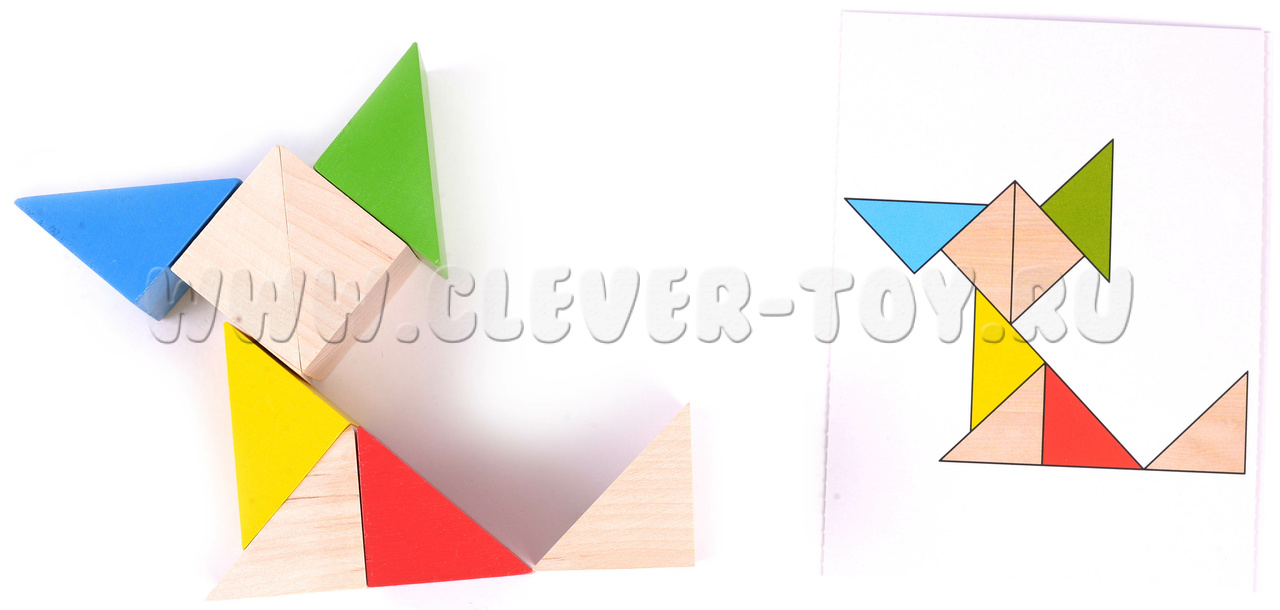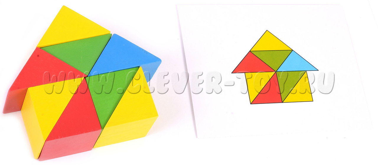 Деревянный конструктор "Занимательные призмы" для самостоятельной сборки ребенком разноцветных фигур по образцам на карточках-заданиях, либо используя воображение.