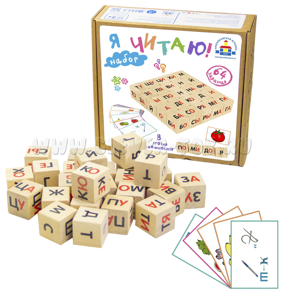 • 25 деревянных кубиков с буквами и слогами,