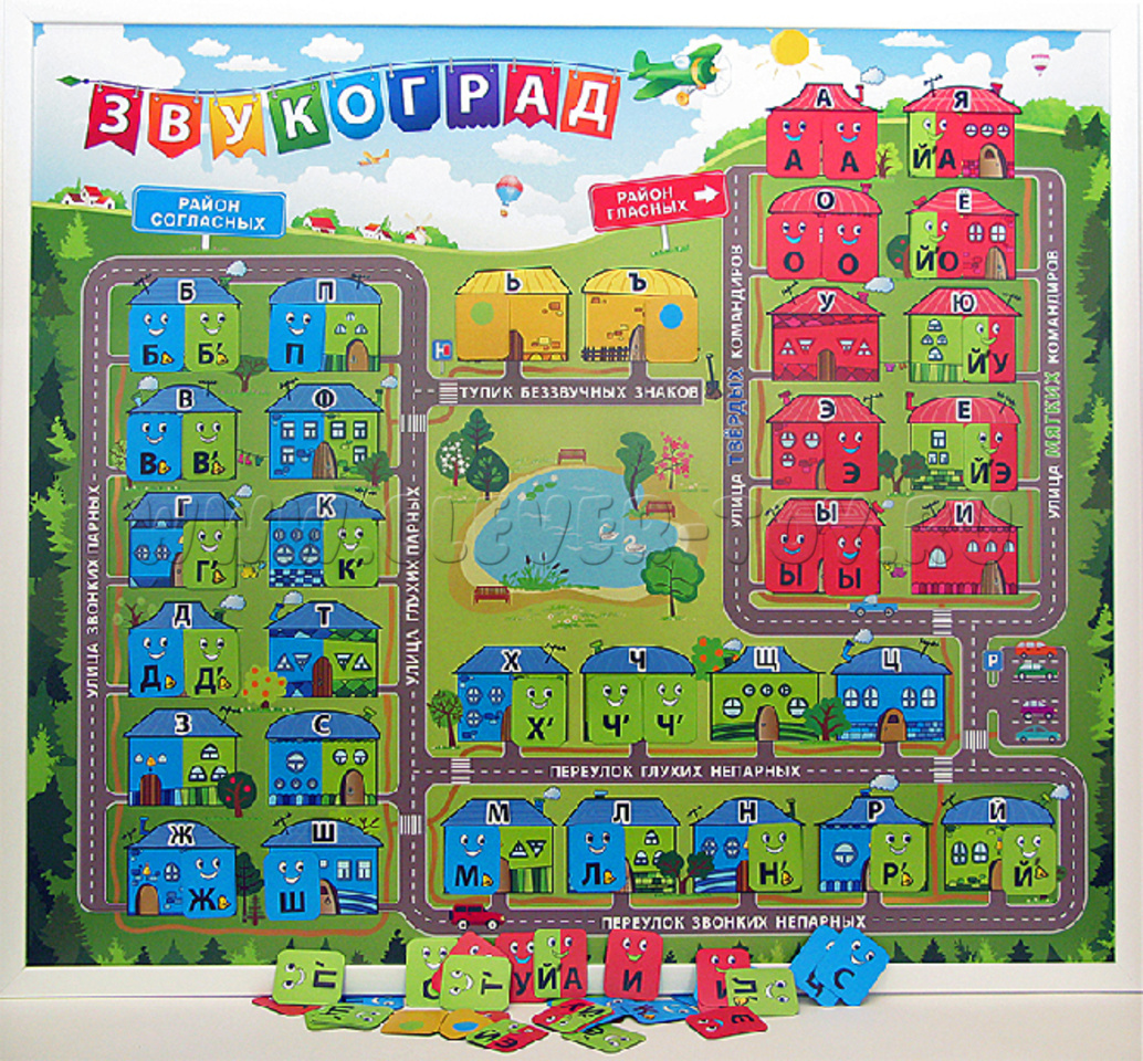- 72 магнитных карточки (5 см * 4 см.) С звуками и буквами.