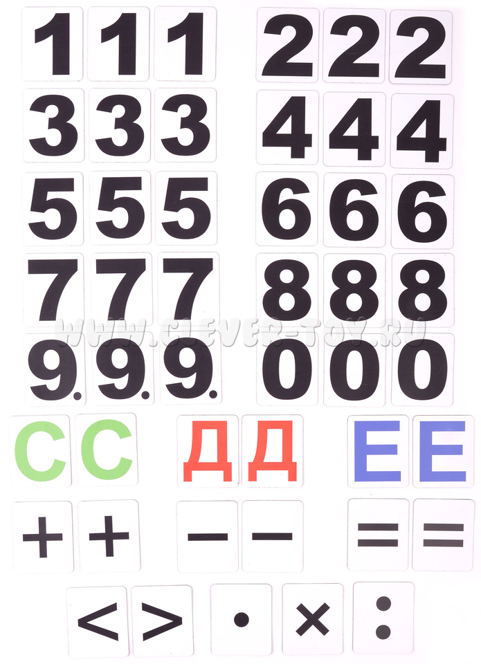 - по 1 карточке со знаками: умножение, деление, больше, меньше - для расширения математических представлений.