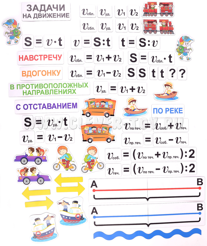 В наборе представлены разнообразные элементы для визуализации задач. Есть карточки с формулами, охватывающими основные типы движения: навстречу друг другу, вдогонку, в противоположных направлениях, с отставанием, а также движение по реке. Для наглядности включены имитация реки и отрезок дороги от пункта А до пункта В.