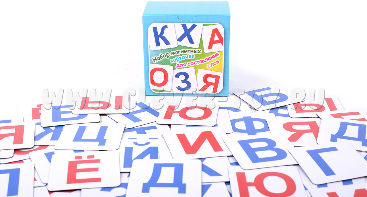 Гласные буквы обозначены красным, согласные - синим или черным: выбирайте, что подходит вам больше. Всего в коробке 70 магнитных карточек с буквами, размер каждой карточки ­– 5*5 сантиметров.