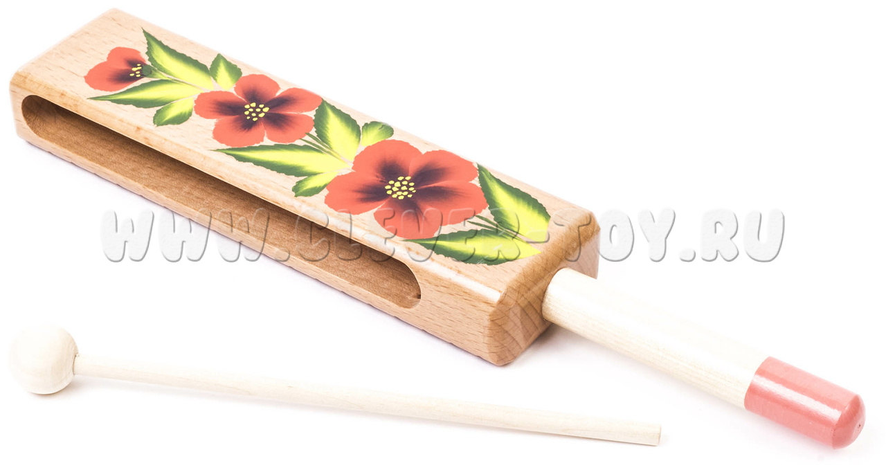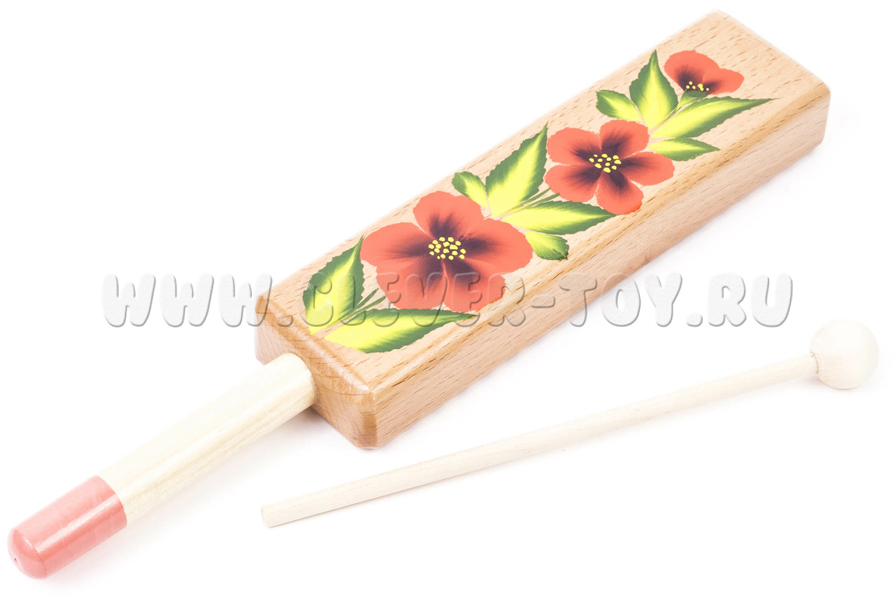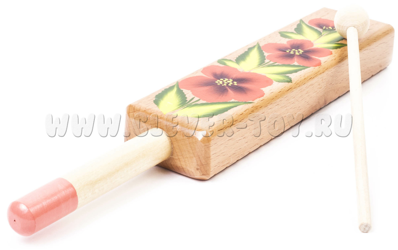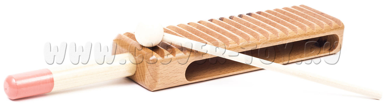 Рубель представляет собой деревянный брус размером 35х70х250 мм. Основание и ручка рубеля выполнены из бука марки "люкс". Музыкальный инструмент комплектуется ударной палочкой с шариком на конце. Материал: бук.
