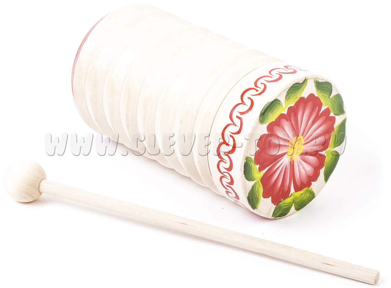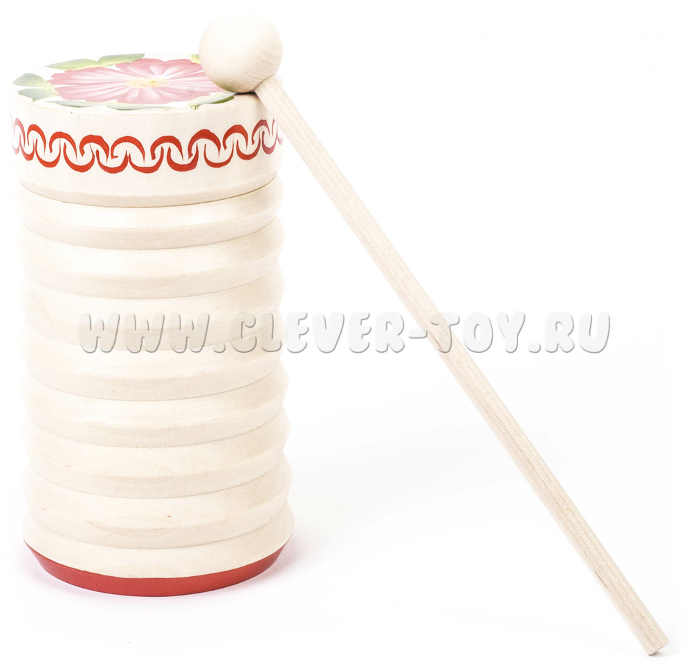 Рубель представляет собой полый деревянный цилиндр. С внутренней стороны гладкий, снаружи - ребристый. Канавки под углом 90 градусов выполнены токарным способом. С одной стороны цилиндр закрыт деревянной бобышкой длиной 35 мм. Музыкальный инструмент комплектуется ударной палочкой с шариком на конце. Размеры: длина 115 мм, диаметр 60 мм. Материал: липа.