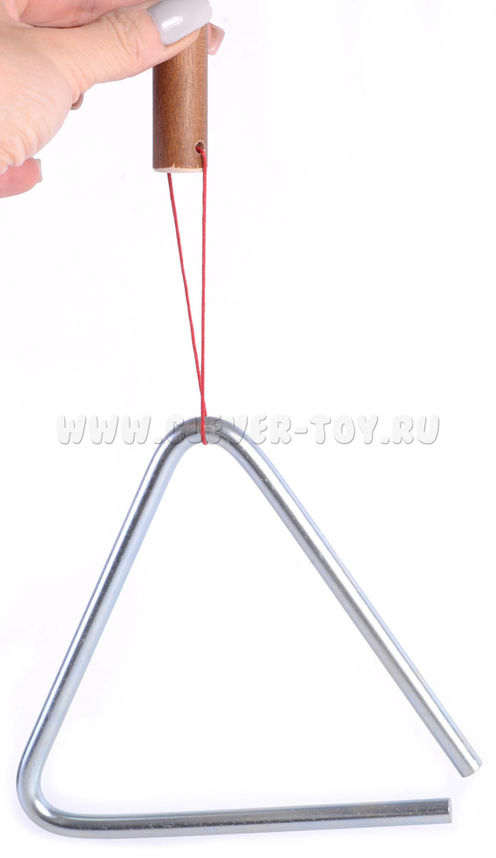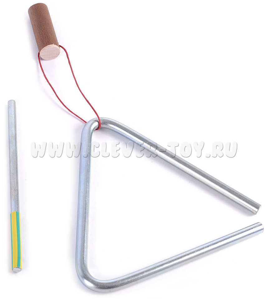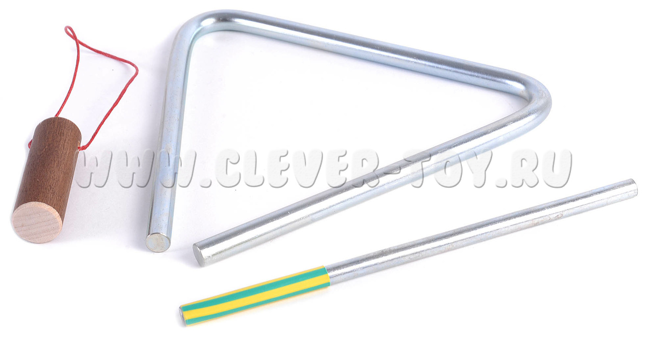Треугольник выполнен из стали диаметром 8мм, длина стороны - 14см. Гальваническое покрытие не ухудшает качество звука и не разрушается при механическом воздействии. Ударная палочка из нержавеющей стали.