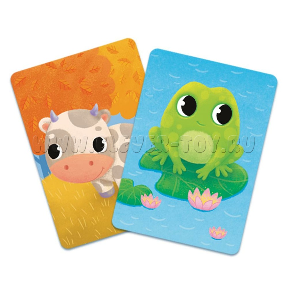 • 30 карточек с изображением животных, всего в колоде 15 совпадающих пар карточек (ёжик, корова, леопард, обезьянка, лягушка, лисичка, львёнок, олень, осьминог, барашек, пингвин, зайчик, сова, поросёнок, попугай);