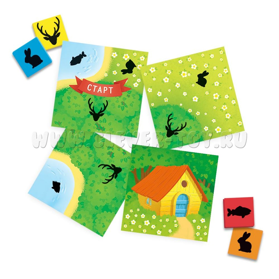 - 36 жетонов животных (заяц, олень, рыбка, разделены на 4 цвета синий, оранжевый, красный, жёлтый);