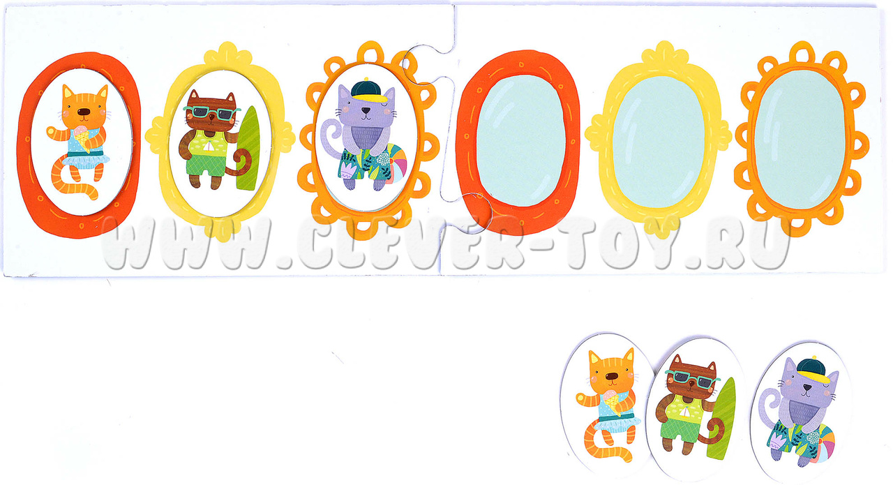 - Игра на поле с рамками. Составное игровое поле разделено на 2 части, в каждой из них по 3 портретные рамки. Распределите фишки с котятами поровну так, чтобы и у вас, и у ребенка на руках оказались одинаковые комплекты. Выложите на своей части поля любую случайную последовательность из 3 фишек. Предложите малышу выложить такую же на своей половине игрового поля. Игру можно усложнить, если предложить ребенку запомнить составленную вами последовательность и воспроизвести ее по памяти;