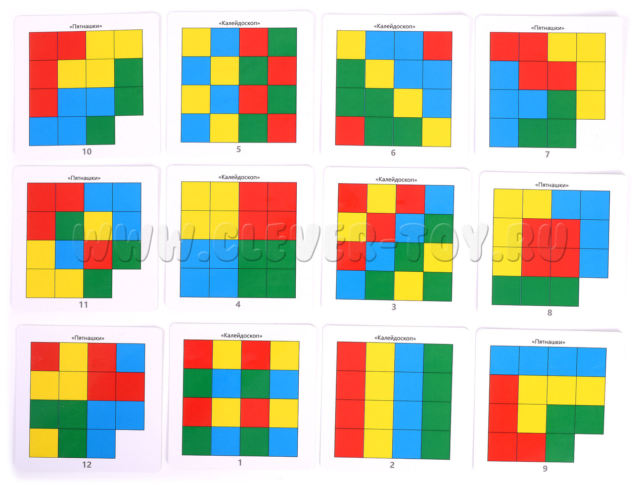 4. Игра "Пятнашки". Установите одну из карточек «Пятнашки» в специальное отверстие посередине игрового поля. Попросите ребенка посчитать количество фишек каждого цвета на карточке. Разместите на одной половине игрового поля соответствующее количество цветных фишек в хаотичном порядке.  Предложите ребенку переместить все фишки по образцу на карточке, передвигая их по игровому полю по одной.