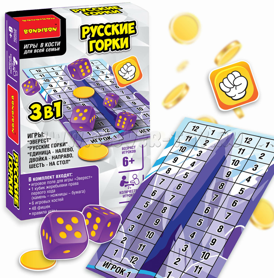 Настольная игра в кости "Русские горки" 3в1 с игровым полем и фишками.