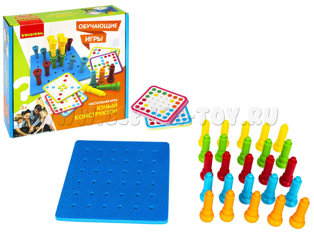 Вставляйте разноцветные колышки в отверстия мягкого коврика в соответствии комбинациям на карточках, либо придумывая свои узоры. 4 уровня сложности заданий.