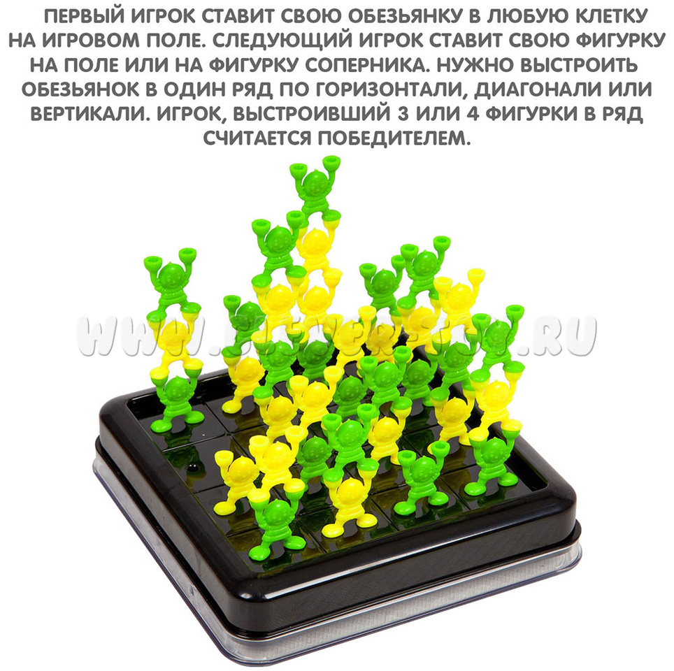3D крестики-нолики нового поколения! Первый игрок ставит свою обезьянку в любую клетку на игровом поле, а следующий - на поле или на фигурку соперника. Нужно выстроить обезьянок в один ряд по горизонтали, вертикали или диагонали. Побеждает игрок, выстроивший 3 или 4 фигурки в ряд. 2 вида игры и 2 уровня сложности.