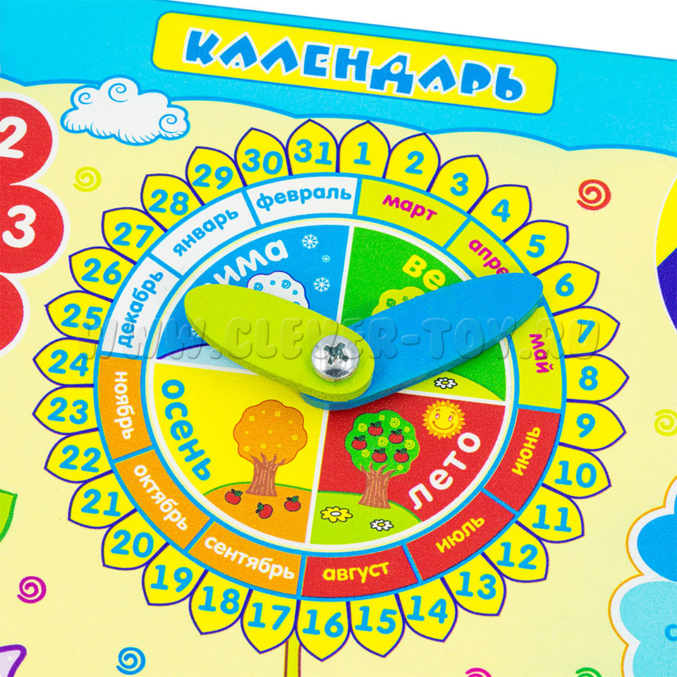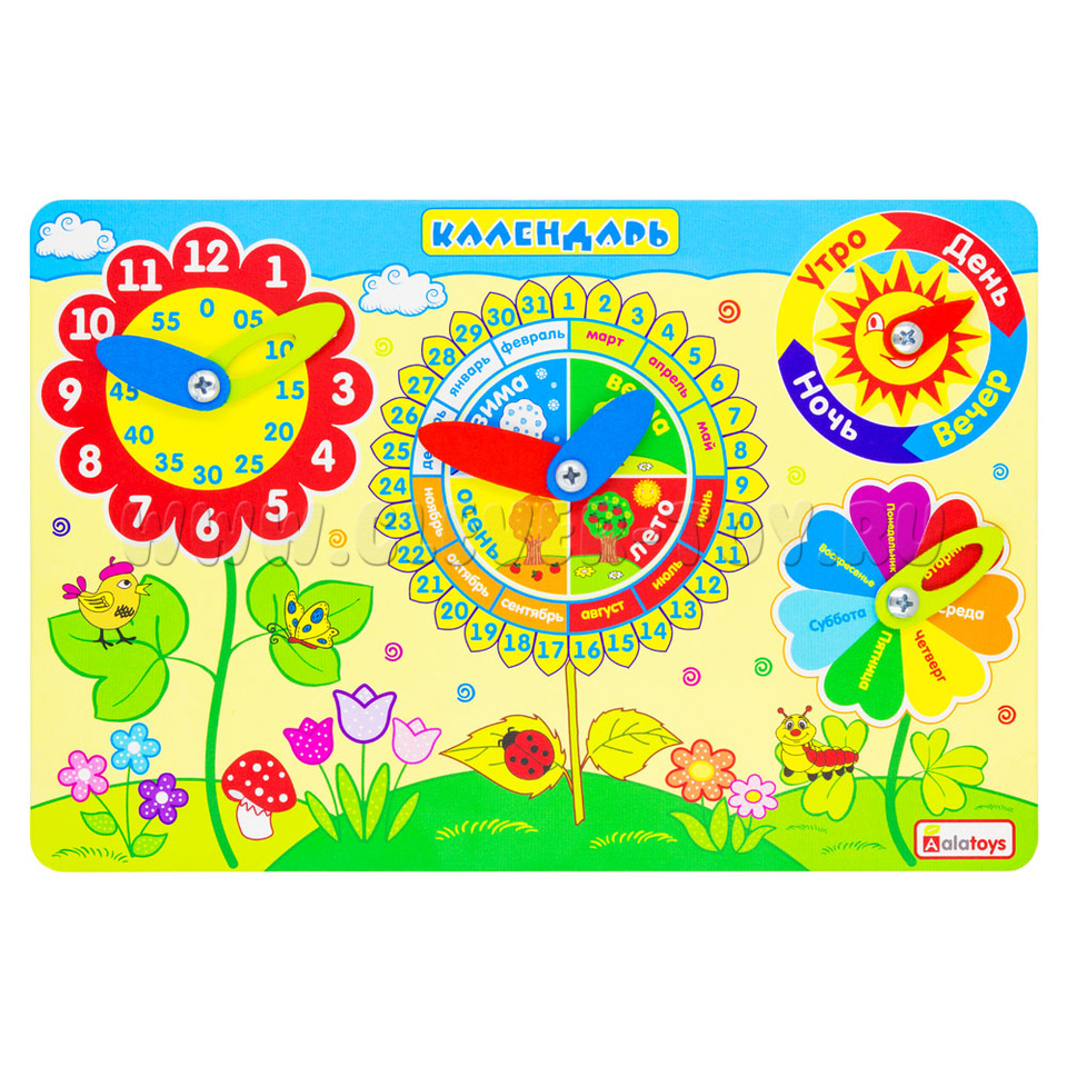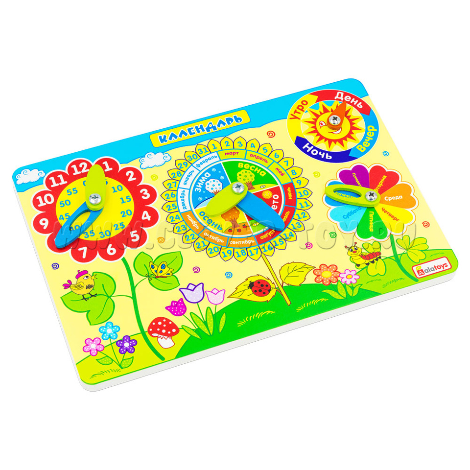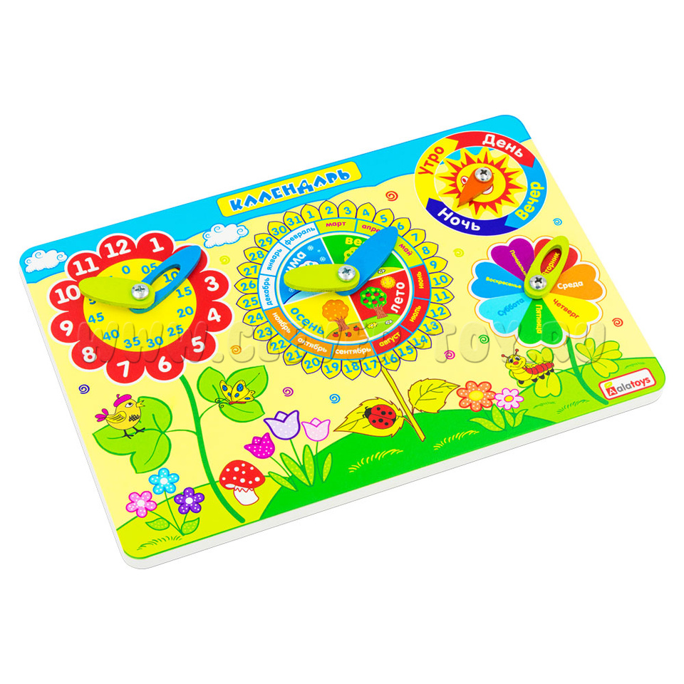Календарь природы поможет малышу в игровой форме познакомиться с понятием времени, выучить основные цвета, дни недели, месяцы, времена года; узнать об особенностях погоды, каждого времени суток. Ребенок сам захочет выставлять узнаваемые данные на циферблатах со стрелочками.