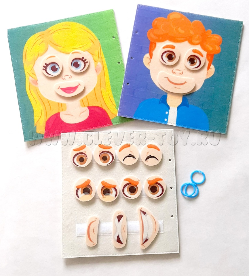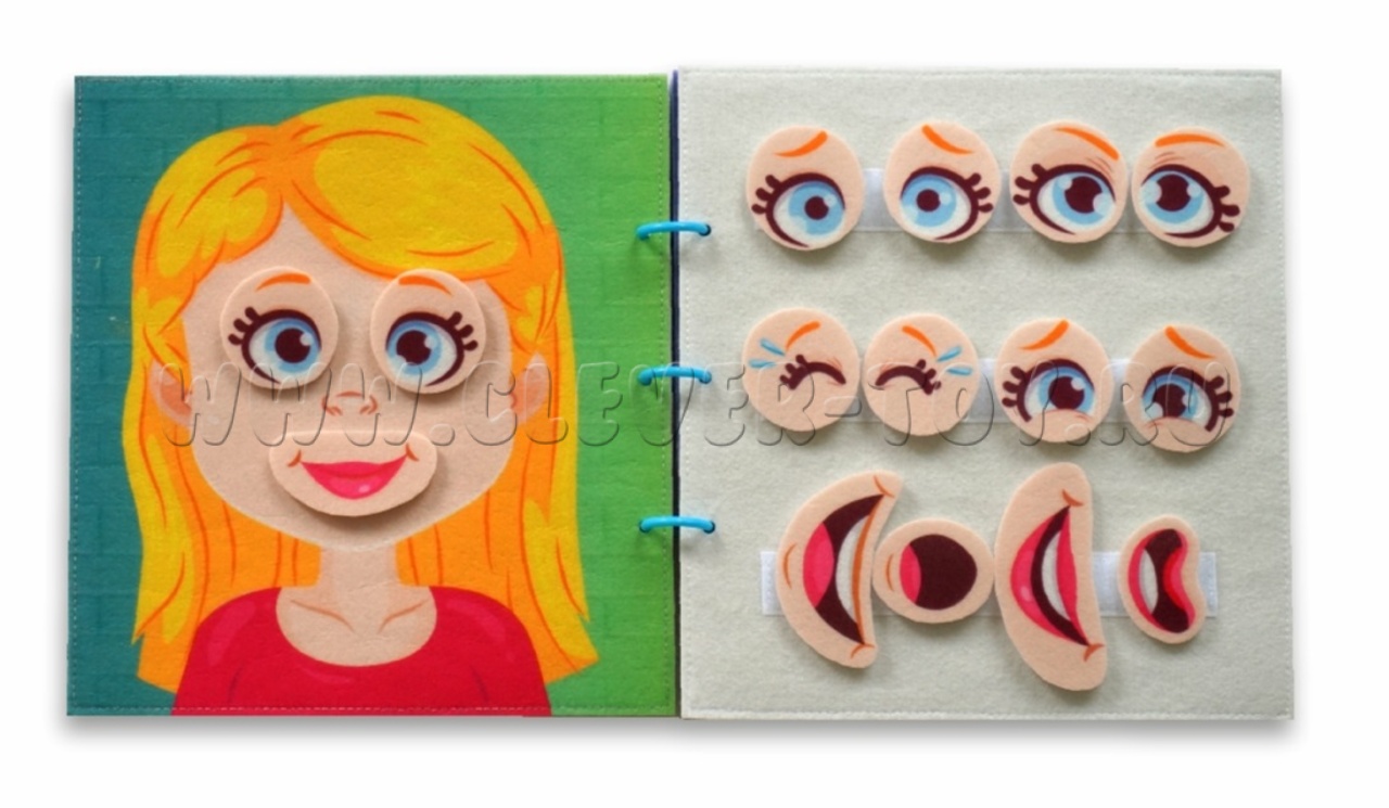 Цель игры - совместить выражения лиц таким образом, чтобы они соответствовали друг другу. Поля папки разделены и соединяются с помощью разъёмных колец. На дополнительной странице размещены липучки с частями лица. Все детали папки и дополнительные элементы изготовлены из фетра. Изображения на страницах нанесены методом сублимационной печати, и изделие можно стирать.