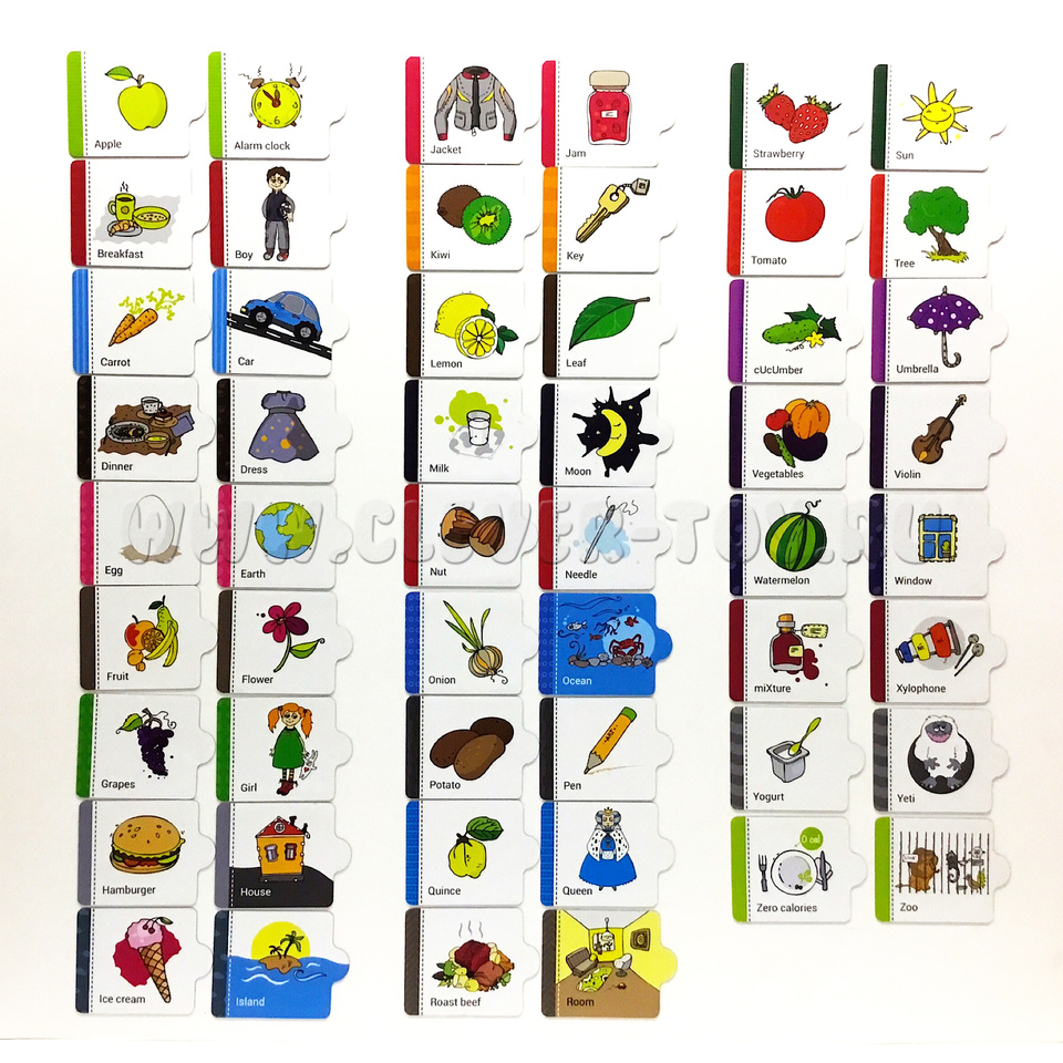 Дополнительный комплект картинок с названиями еды и предметов к магнитному английскому алфавиту.