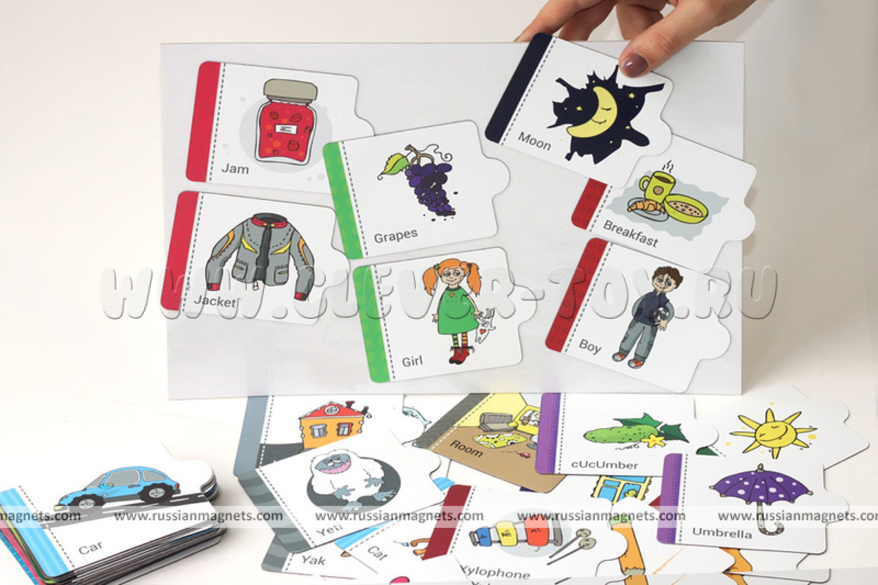 В дополнительном наборе карточек нет английских букв — для начала изучения алфавита вам понадобится базовый набор с буквами и животными. Зато в этом комплекте карточек вы найдёте по две картинки на каждую букву алфавита! Здесь мы собрали целую азбуку английских названий различных овощей, фруктов и другой еды, а также подобрали каждой букве по одному очень полезному слову из предметного мира.