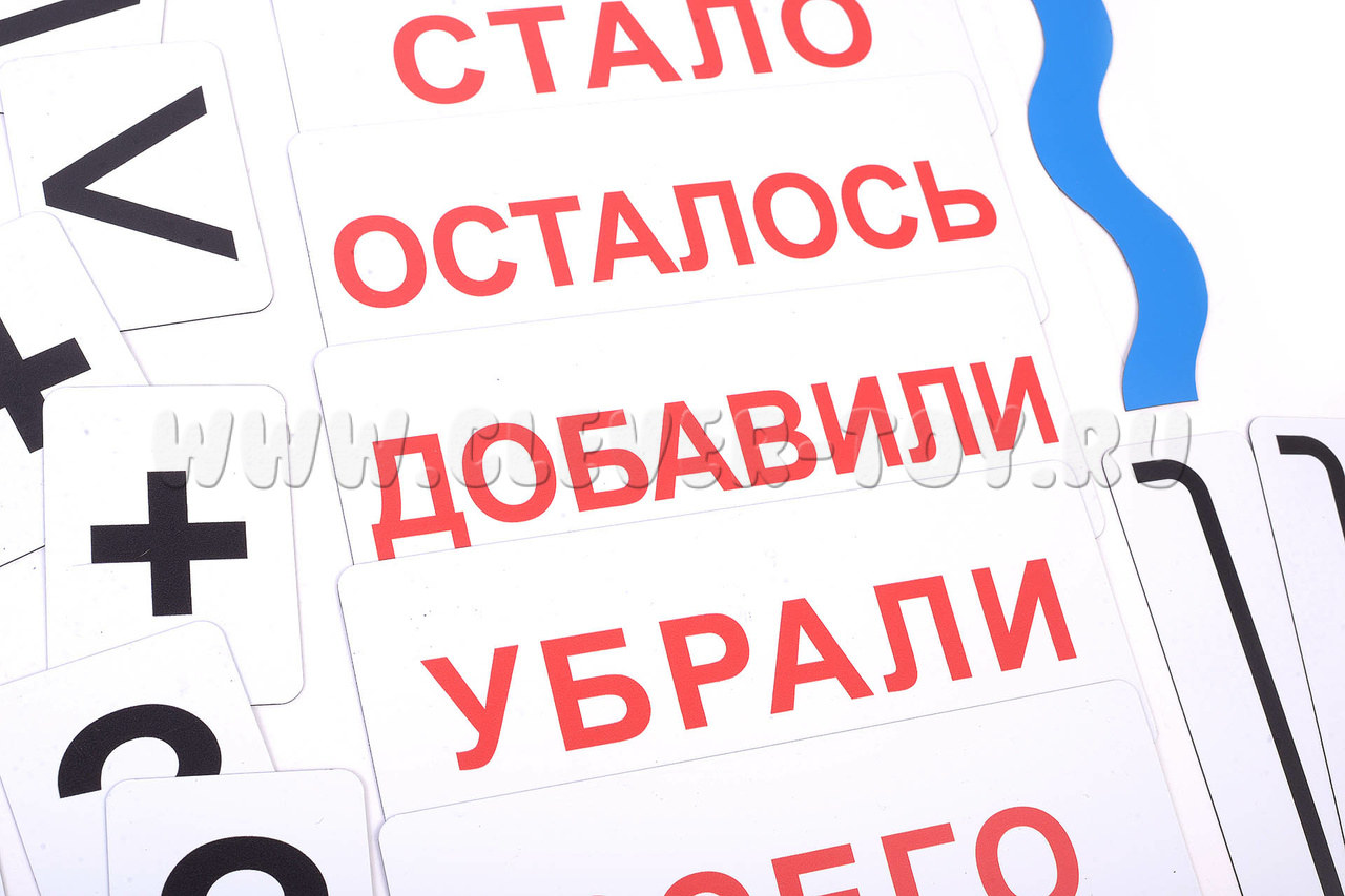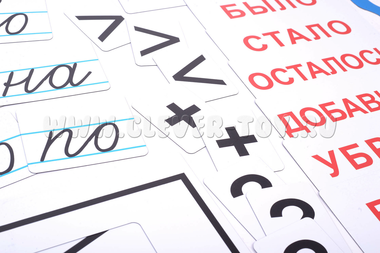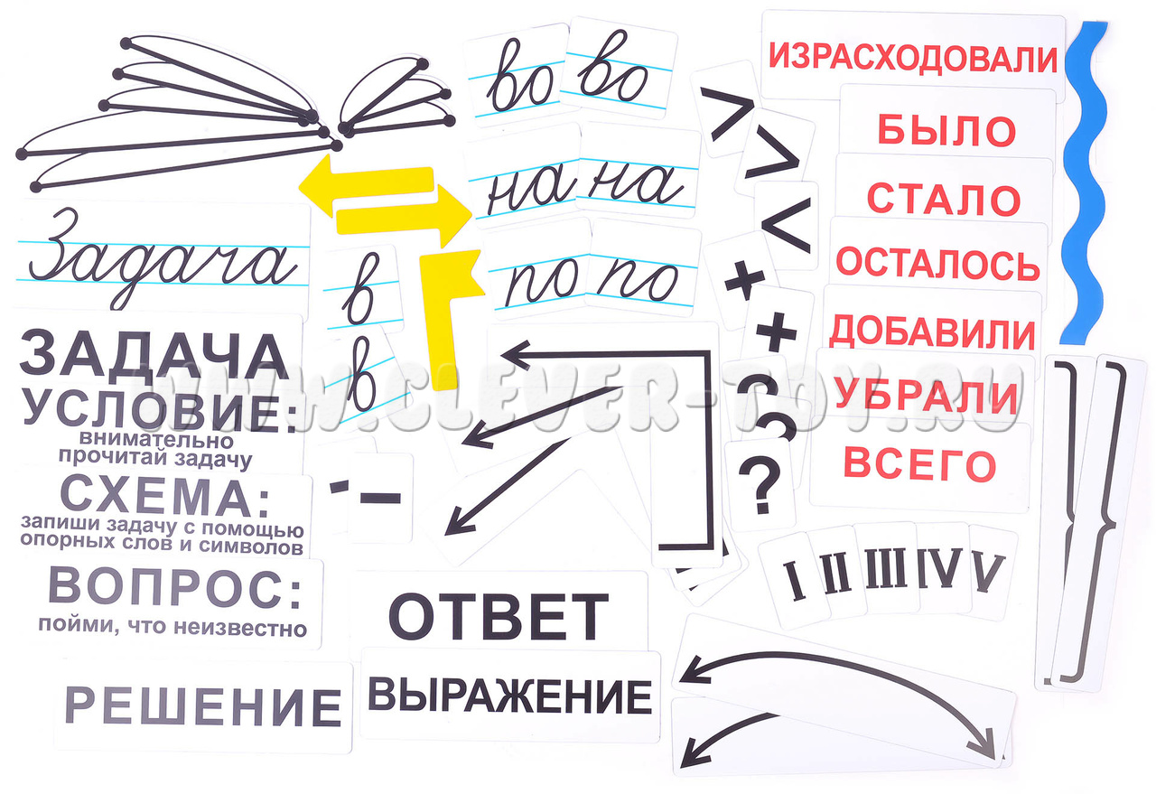 Карточка со словом «Задача», написанная в строчку. Четыре карточки с разными предлогами, по две штуки каждой, также написанные в строчку прописными буквами. Семь магнитных карточек со словами, которые помогут ребёнку понять суть задачи. Семь карточек с красными словами — это вспомогательные карточки, с помощью которых ребёнок быстрее научится находить правильный ответ. Четыре карточки со знаками, по несколько штук каждой. Пятнадцать карточек-схем. Римские цифры до пяти. Размер карточек позволяет видеть их даже с дальних парт.