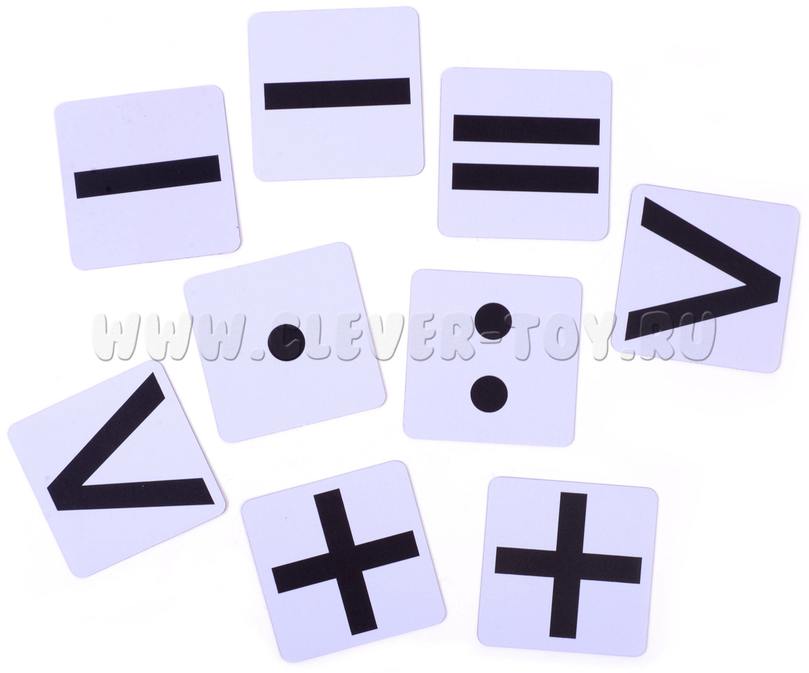 В коробке содержится 9 ярких карточек с математическими знаками, выполненных на привлекательном оранжевом или фиолетовом фоне. В комплект входят: два знака "плюс", два знака "минус", по одному знаку "равно", "умножить", "разделить", а также знаки "больше" и "меньше".