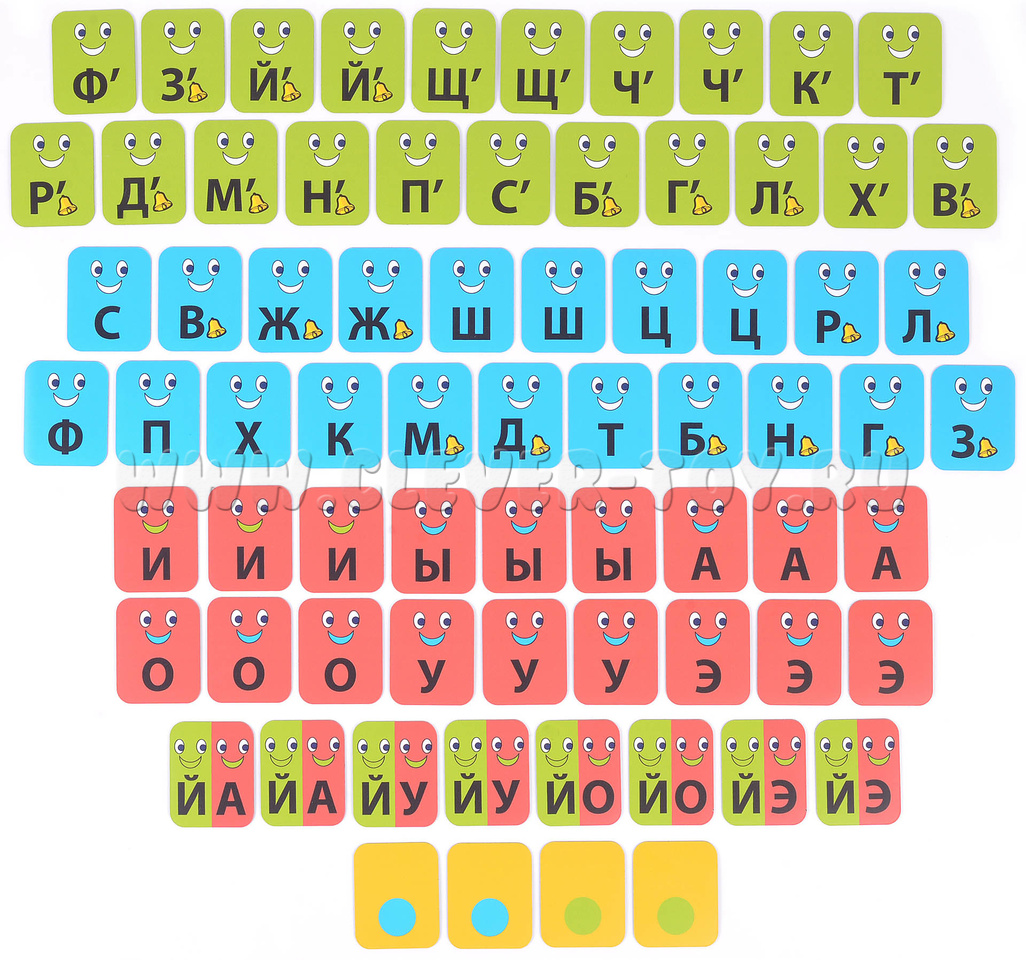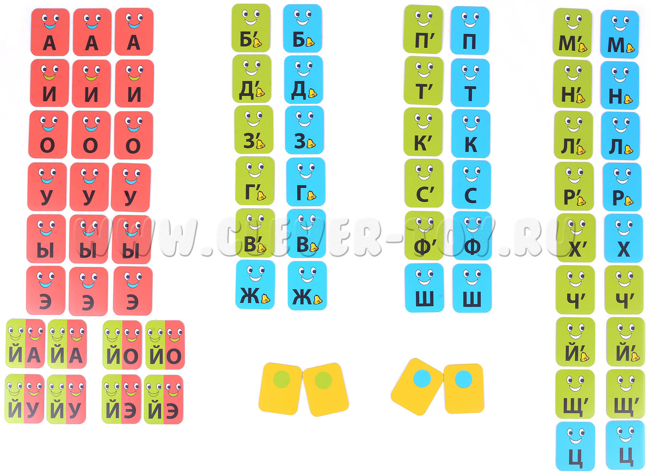 -Согласные звуки представлены двумя карточками каждый, с цветовой маркировкой твёрдости и мягкости