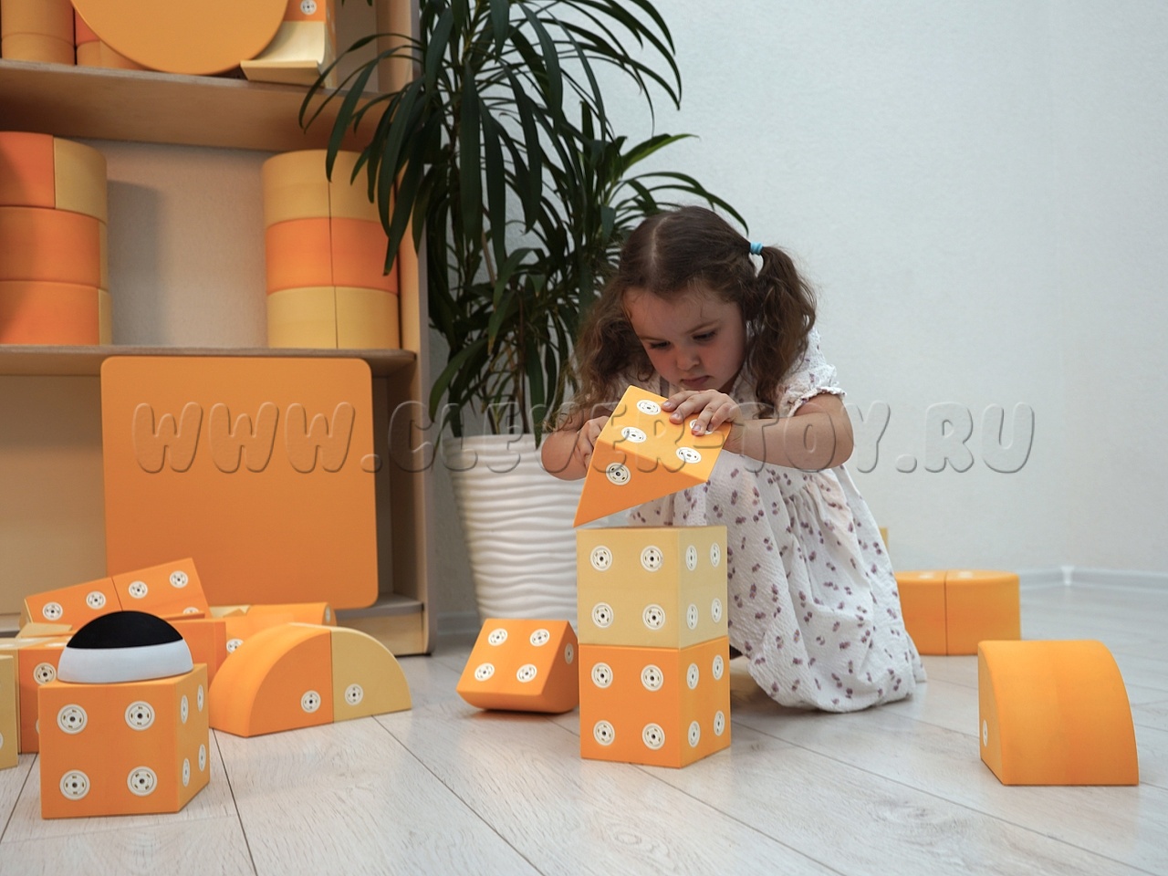 Напольный конструктор выполнен в двух цветах.Крупные детали в виде геометрических фигур выполнены из мягкого гипоаллергенного материала. Крепления имеет магнитную систему для быстрой и простой стыковки-расстыковки деталей. У каждой детали есть от 4 до 24 вариантов магнитной стыковки, что дает полную свободу для творчества.