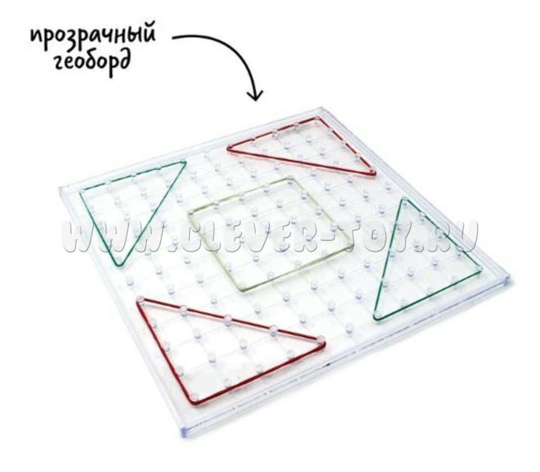 • Прозрачный геоборд - развивающий инструмент для формирования пространственного мышления через создание геометрических фигур и узоров с помощью резинок на специальной доске.