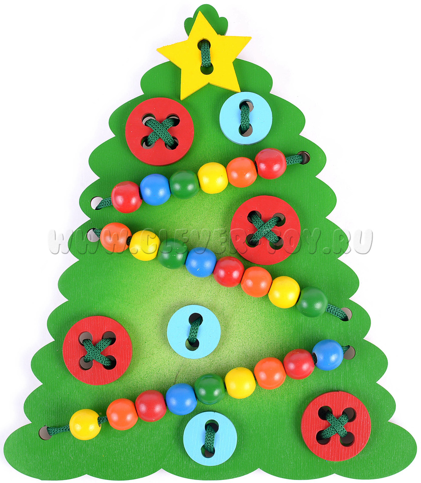 Шнуровка "Новогодняя Елочка" предназначена для развития мелкой моторики и координации движений в игровой форме. Ребенок узнает, как пришиваются пуговицы и научится делать стежки.
