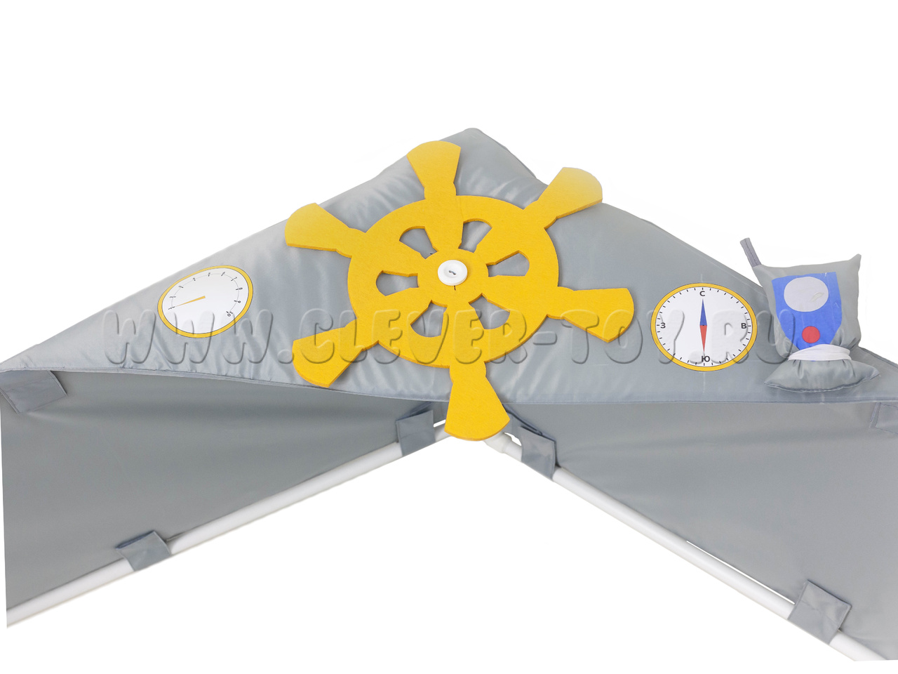 Нос корабля 1 штука - треугольная деталь серого цвета (равнобедренный треугольник, у которого основание 88 см, а две другие стороны 59 см) с наклейками, резинкой для рации и рацией, штурвалом из фетра желтого цвета пристегивающимся на пуговицу.