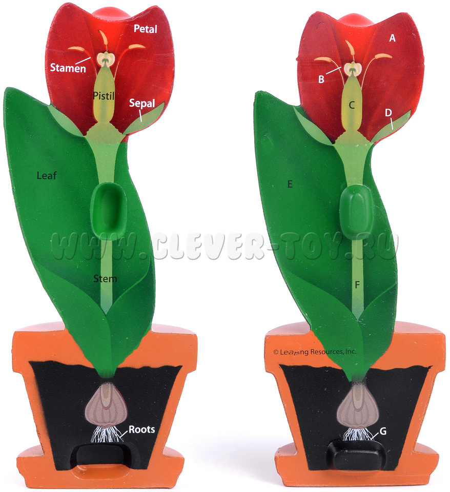 Реалистично подробная пластиковая модель цветка разделяется на половинки: на одной - названия частей цветка (на английском языке), на другой - только буквенное обозначение, для самостоятельной проверки.