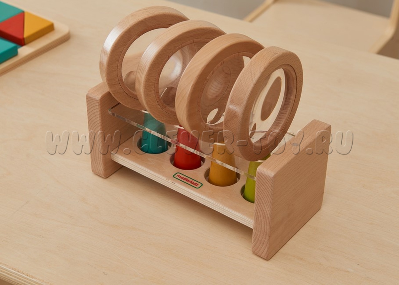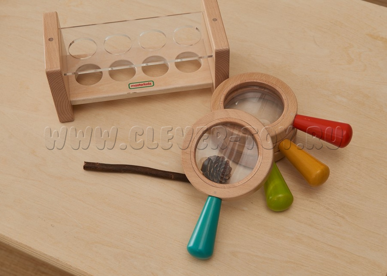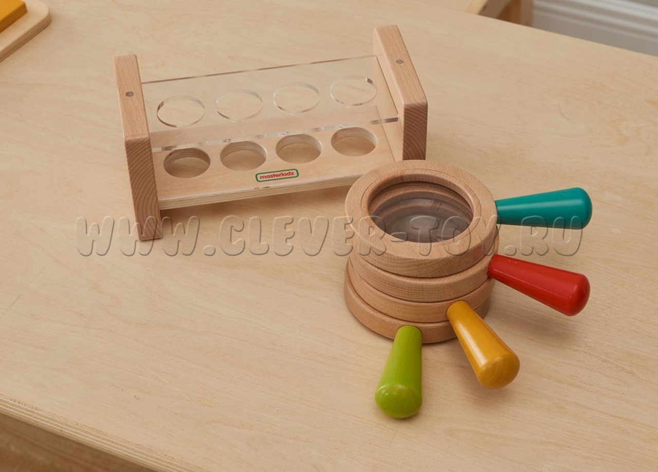 Набор из 4 луп с удобными деревянными ручками 4-х цветов (красный, синий, желтый, зеленый). В каждом имеется увеличительная линза с 3х - кратным увеличением.