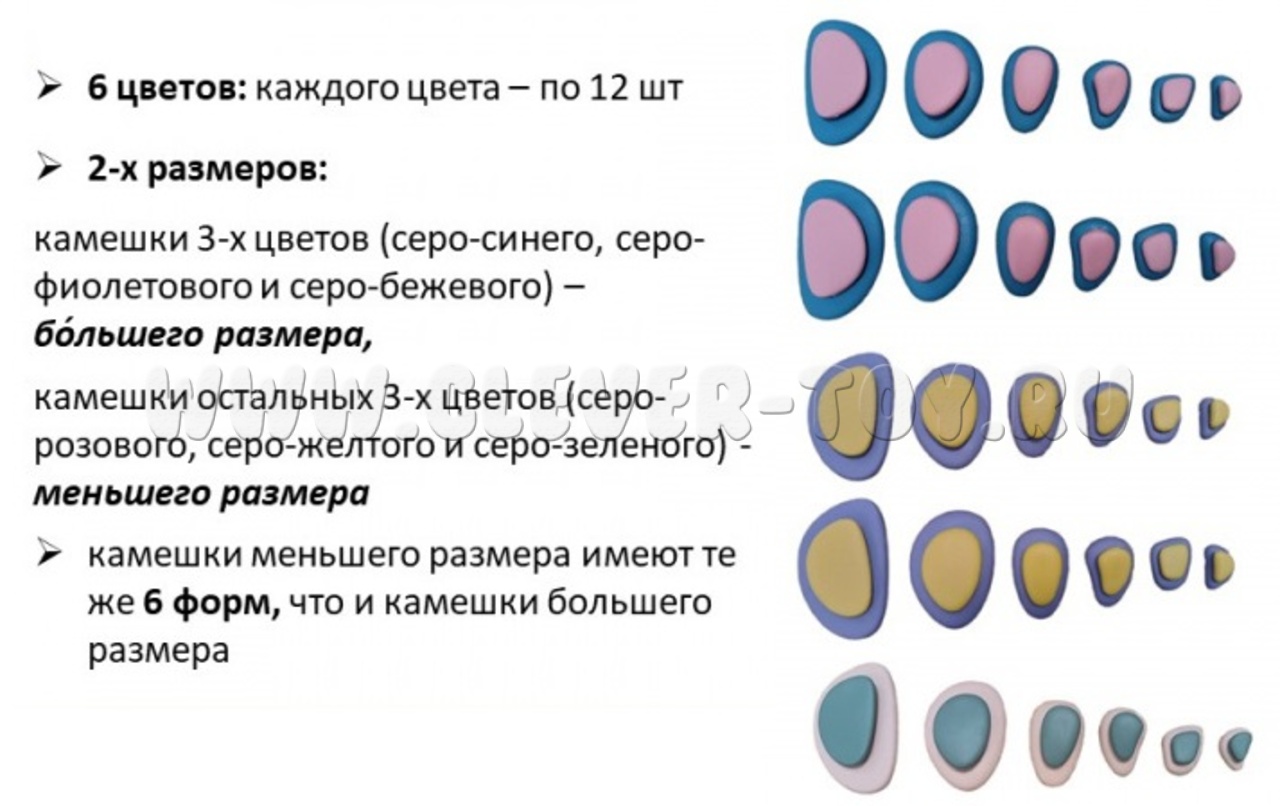 - 72 камешка 6 форм в 2 размерах, 6 цветов,