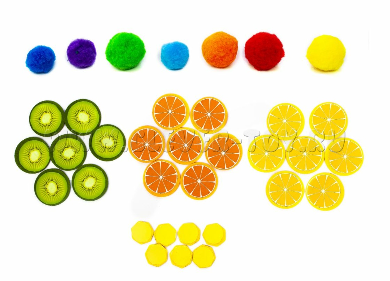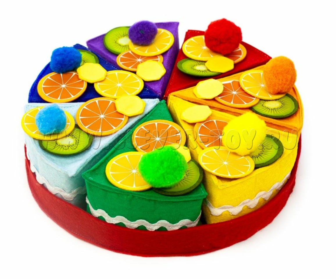 - 7 кусочков торта  по цветам радуги, украшеия для торта: 7 бананов, апельсинов, киви и лимонов, 7 помпонов (зефирки) цветов радуги,